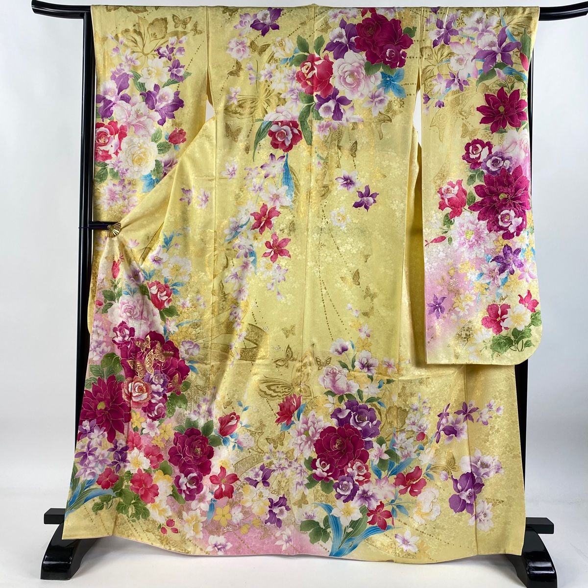 振袖 身丈166.5cm 裄丈66cm M 袷 袋帯フルセット 薔薇 蝶 箔 金彩 薄黄 正絹 秀品の検索結果