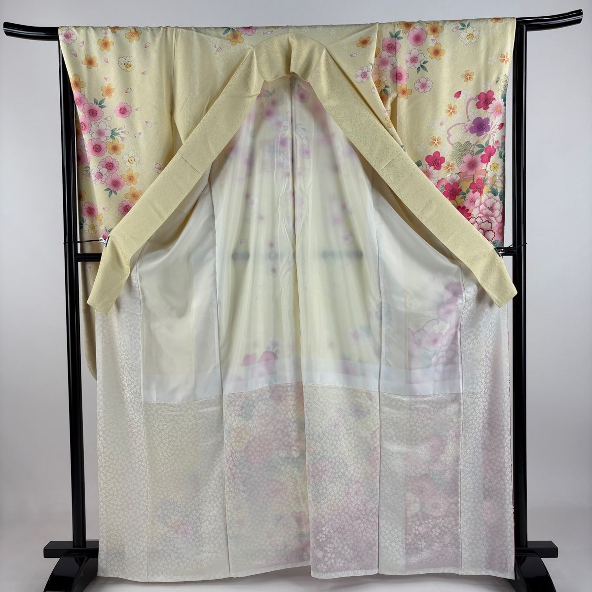 振袖 身丈166cm 裄丈66.5cm M 袷 桧扇 牡丹 箔 金彩 薄黄 正絹の検索結果