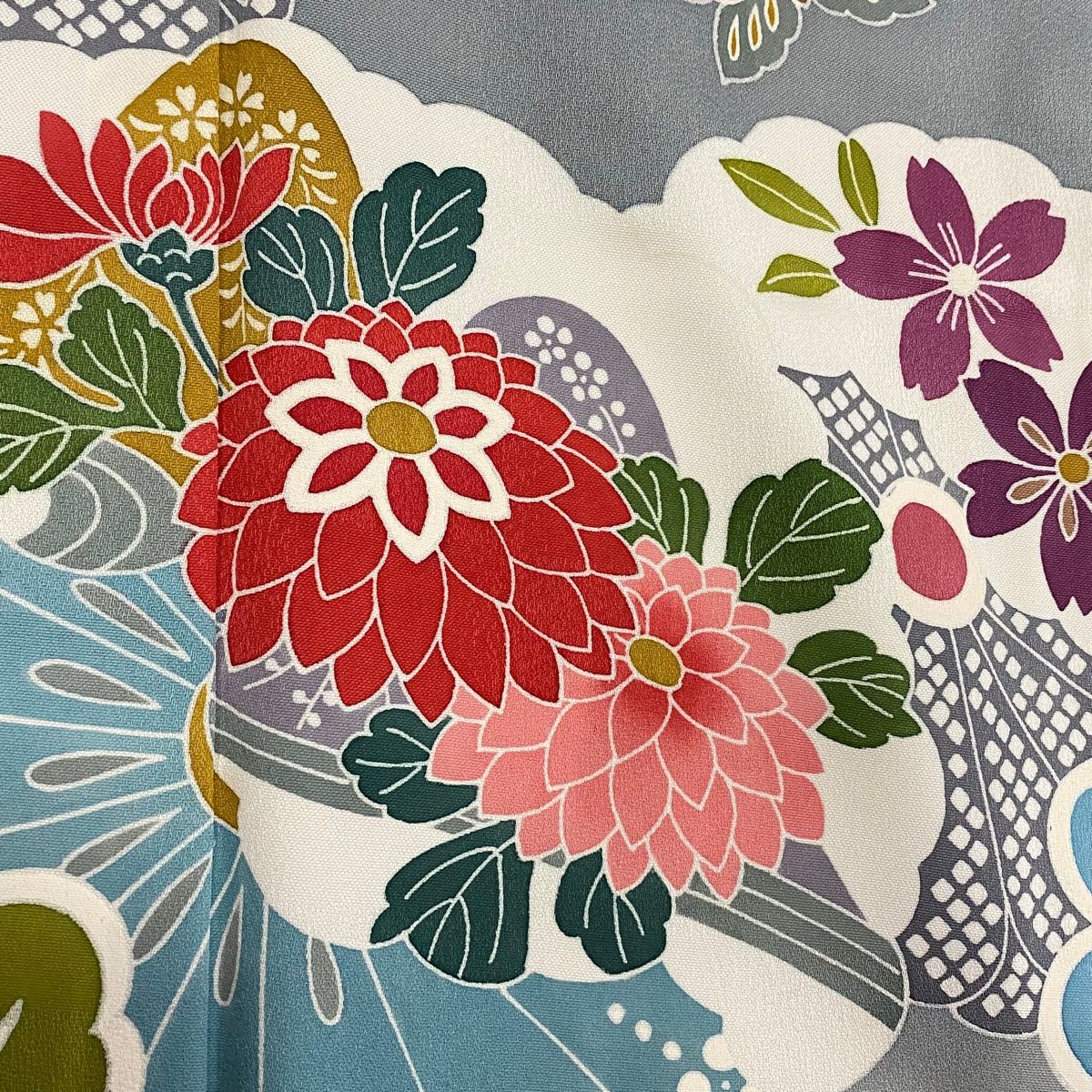 振袖 身丈162.5cm 裄丈65cm M 袷 千地泰弘 落款 菊 蝶 ぼかし 青灰色 正絹の検索結果