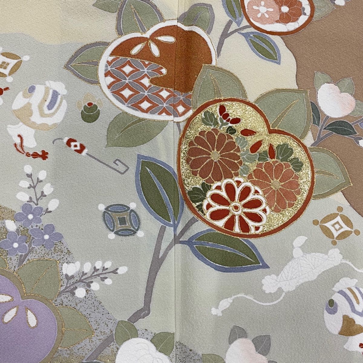 訪問着 身丈154cm 裄丈65cm M 袷 橘 宝尽くし 金彩 染め分け 薄茶色 正絹 秀品 一つ紋の検索結果