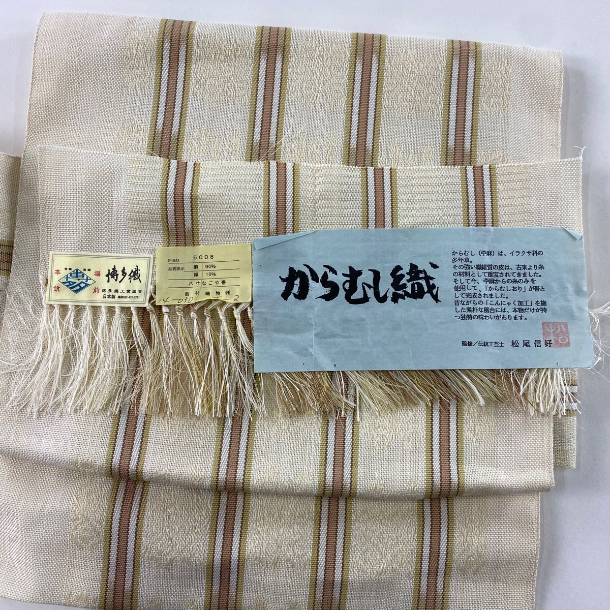 付け帯 落款 作り帯 夏帯 縞 本場筑前博多織 からむし織 ベージュ 麻 WWW_GLOBALQUALITYIMPORTS_COM