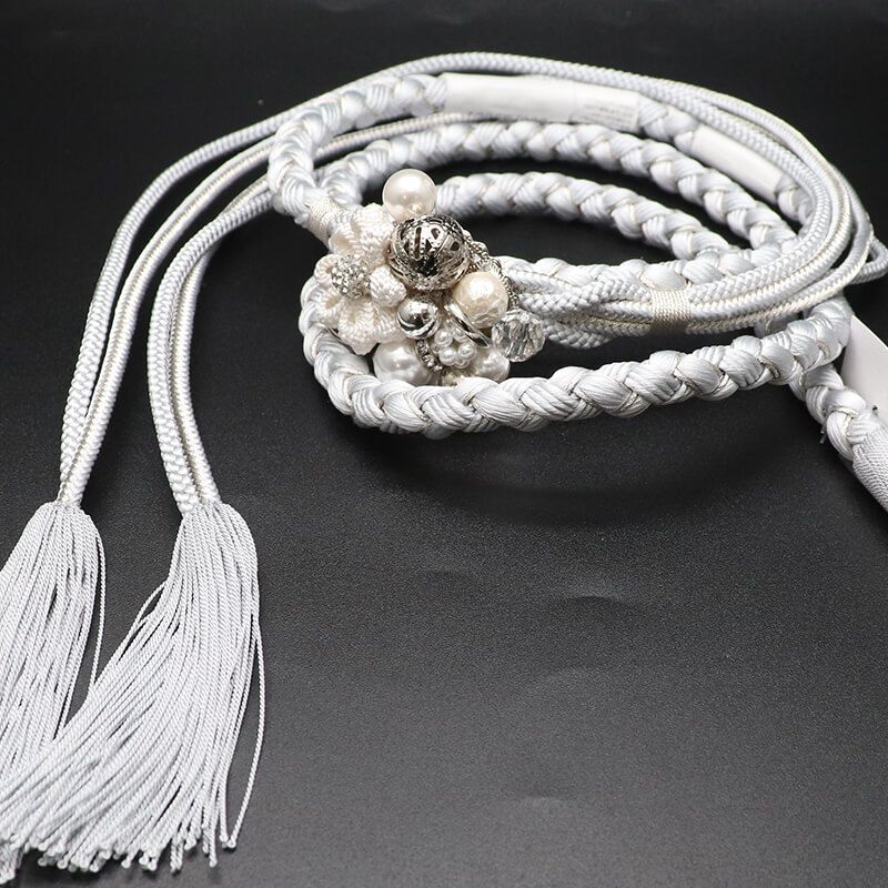 帯締め 振袖用 飾り付き 正絹 丸組 灰白 パール飾り 煌びやか 長さ160cm 幅1.2cm 着付け小物 和装小物 WWW_GLOBALQUALITYIMPORTS_COM