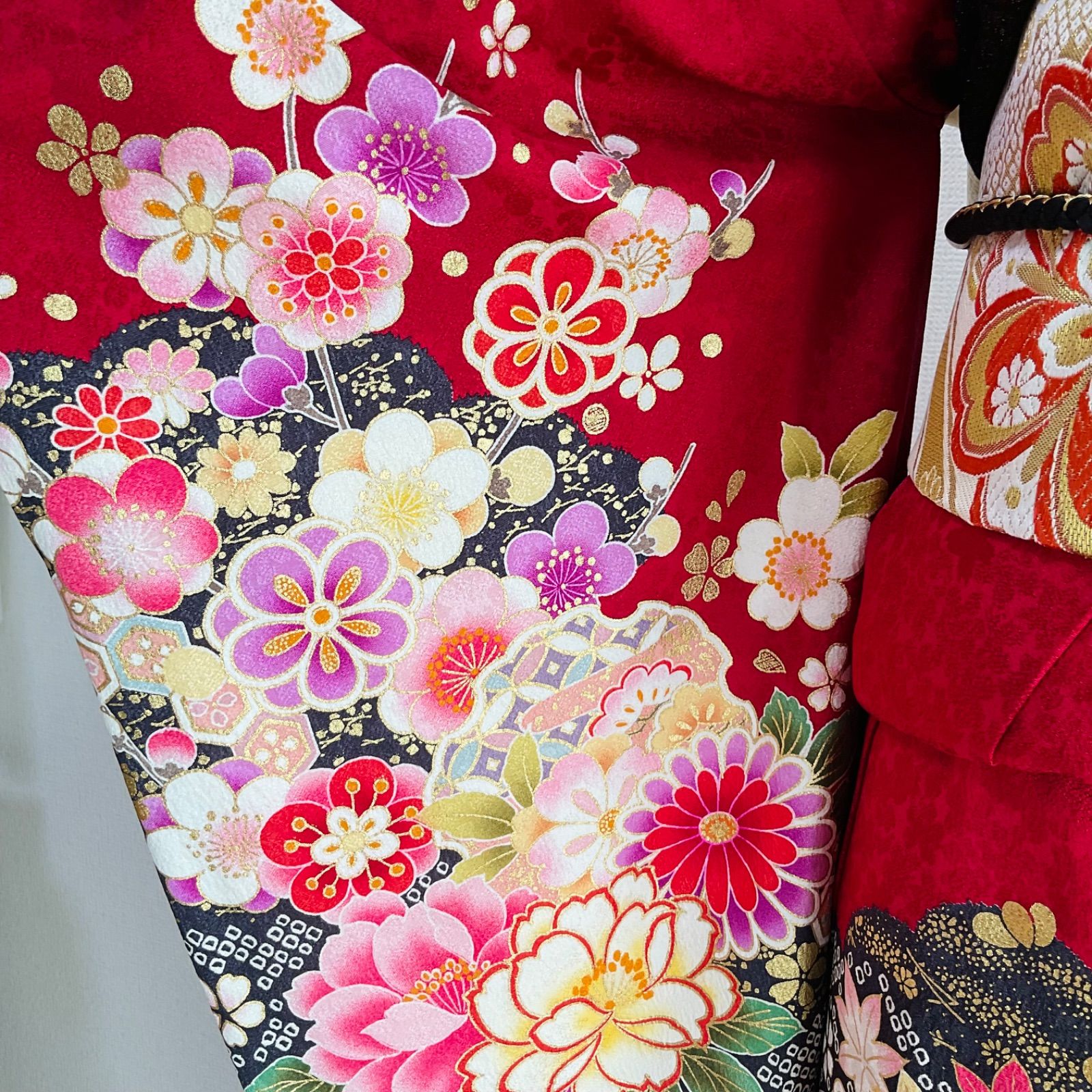 濃い赤地に色とりどりの花柄、御所車や熨斗柄が素敵な振袖です。赤と黒のコントラストが映えます。