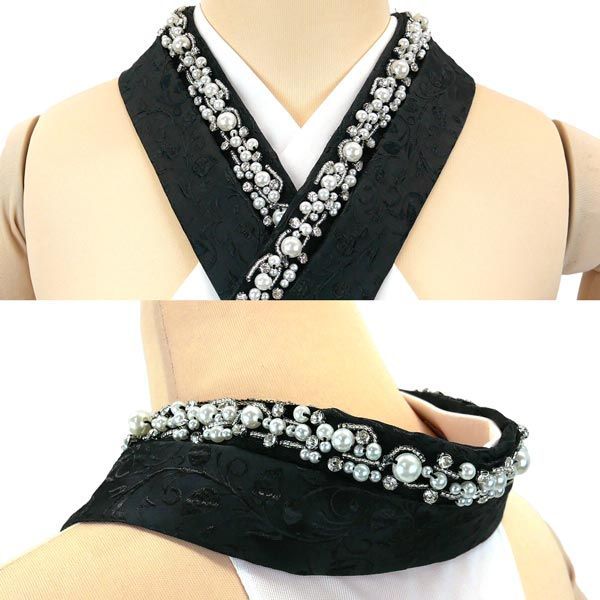 光沢のある地紋入り生地の重ね衿に、樹脂パールやクリスタルガラス、メッシュレースなどが装飾されたとてもモダンな重ね衿です。