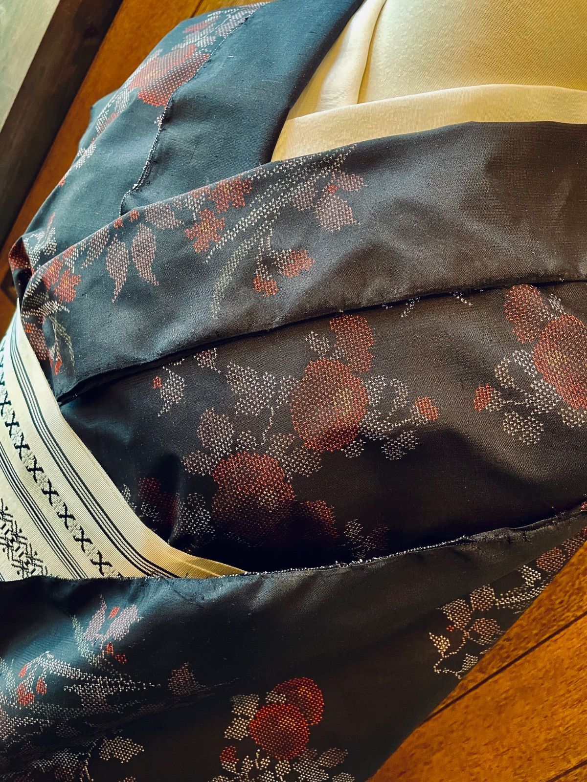 後半の写真はマネキンにイメージとして着物風に着せてみました。元値は42万円です。