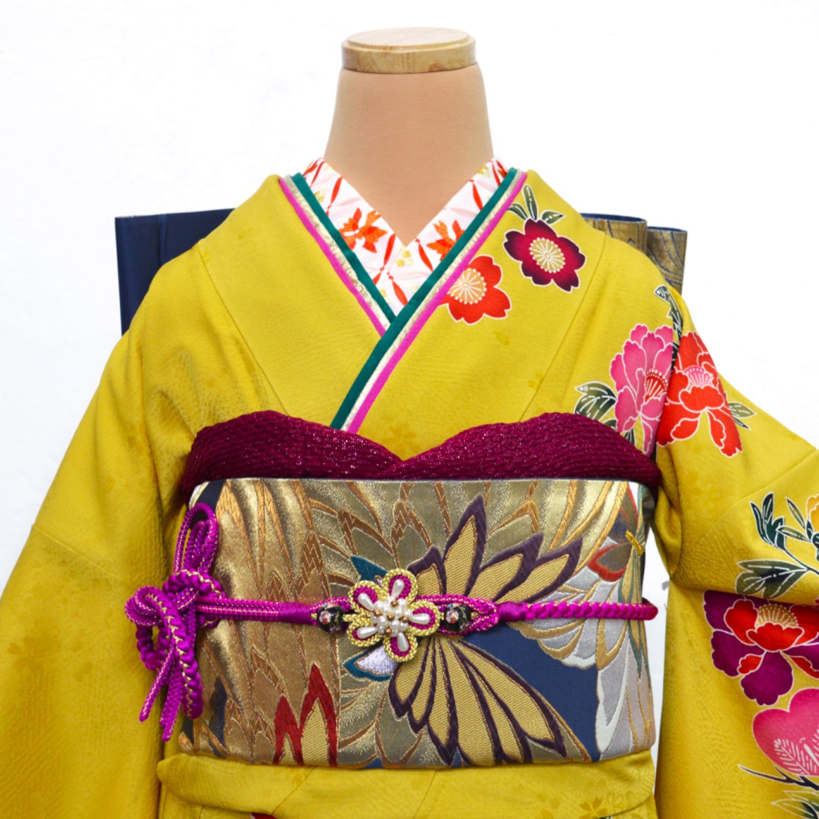 艶やかな山吹色の地に、牡丹や菊、藤の花などがあでやかに描かれた一枚は、地色の華やぎと花々の彩りが調和し、晴れの日にふさわしい堂々とした存在感を放ちます。