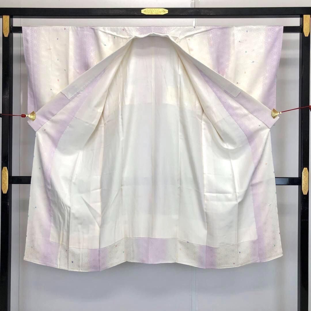 乳白色の品のあるお色味に暈し、麻の葉模様に小さな絞り柄のデザインが可愛らしい素敵な柄裄のお品でございます。