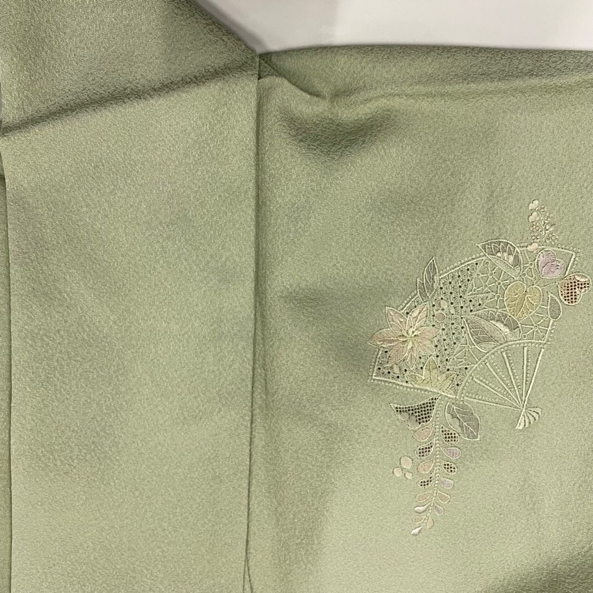 付下げ 身丈164cm 裄丈65cm M 単衣 扇 草花 刺繍 薄緑 正絹 秀品 WWW_GLOBALQUALITYIMPORTS_COM