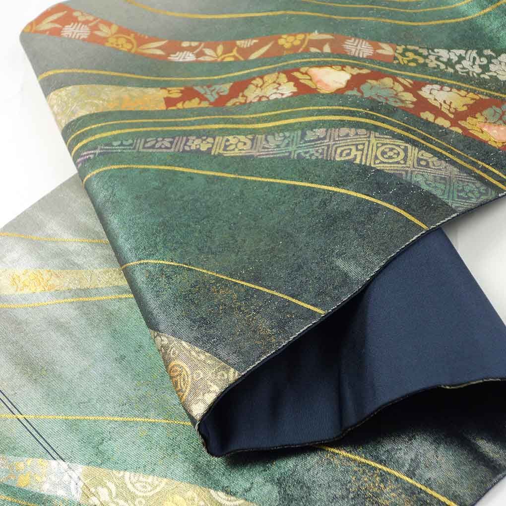 名古屋帯 幅30cm 長さ345cm レディース 抽象柄 秋冬春用 正絹 シルク グリーン リメイク リユース リサイクル 呉服のきくや WWW_GLOBALQUALITYIMPORTS_COM