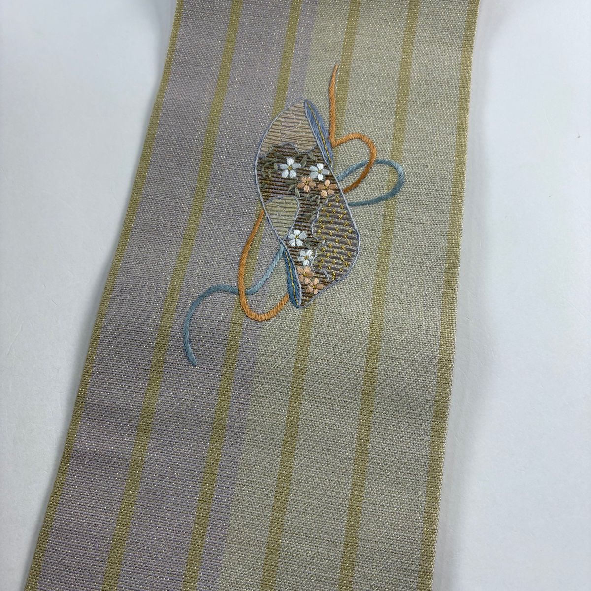 名古屋帯 秀品 誰が袖 縞 刺繍 金通し 灰紫 正絹 WWW_GLOBALQUALITYIMPORTS_COM