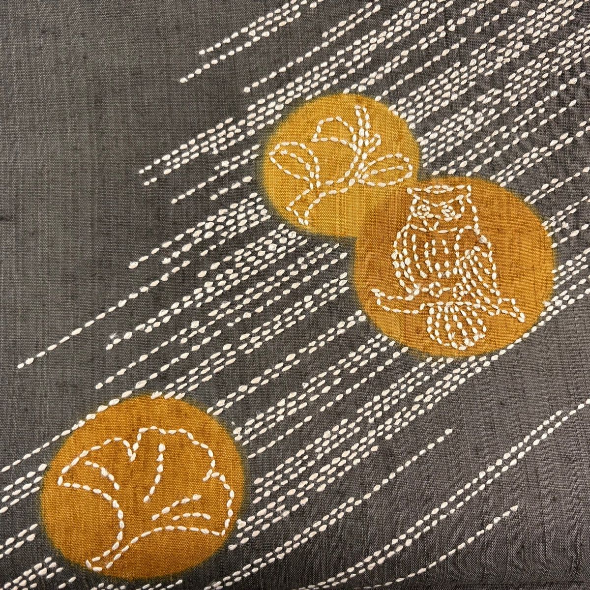 名古屋帯 紬地 フクロウ 銀杏 刺し子刺繍 ぼかし 深緑 正絹 WWW_GLOBALQUALITYIMPORTS_COM