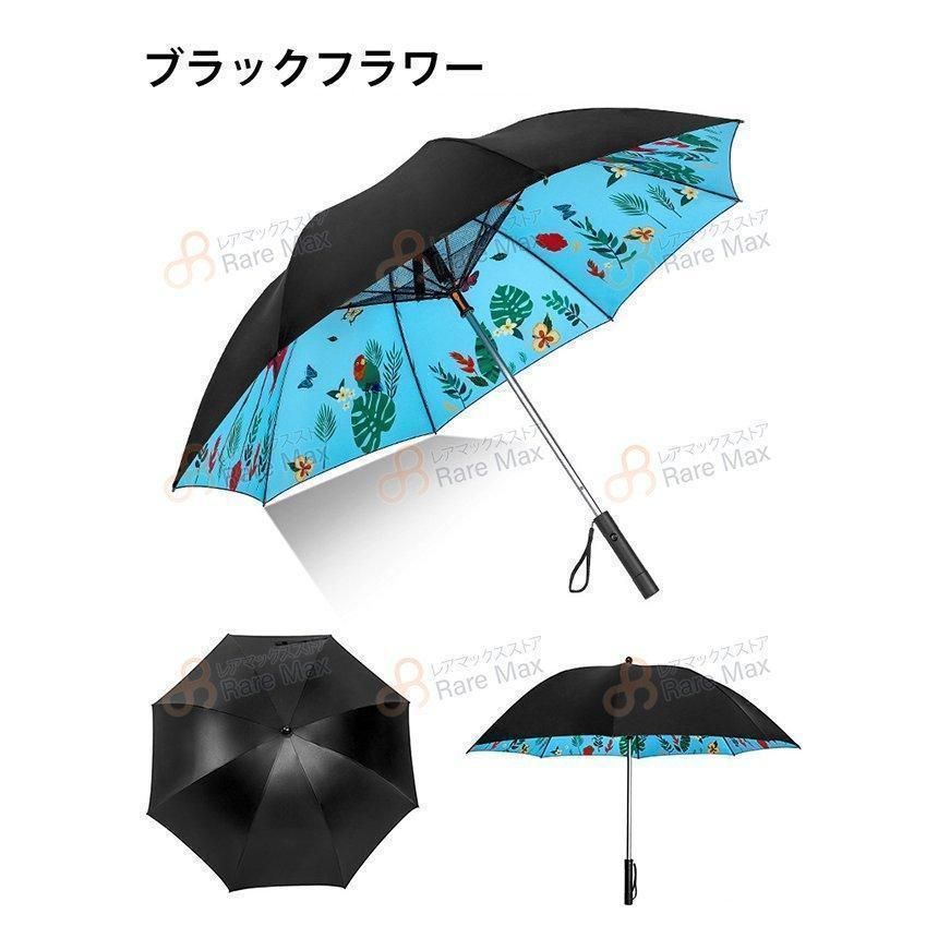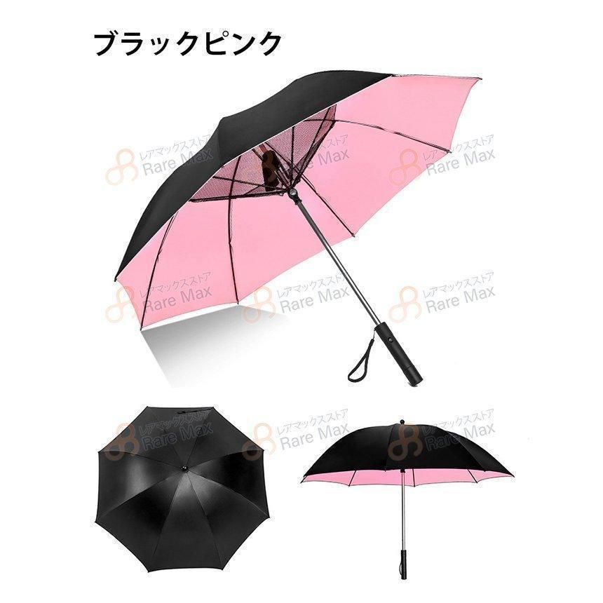 【扇風機機能】傘に搭載された専用の扇風機から吹き降りてくる風が首や頭などに当たり涼しくて快適です。傘にこもった空気を扇風機で追い出し、まるで木陰にいる涼しさに感じられます。