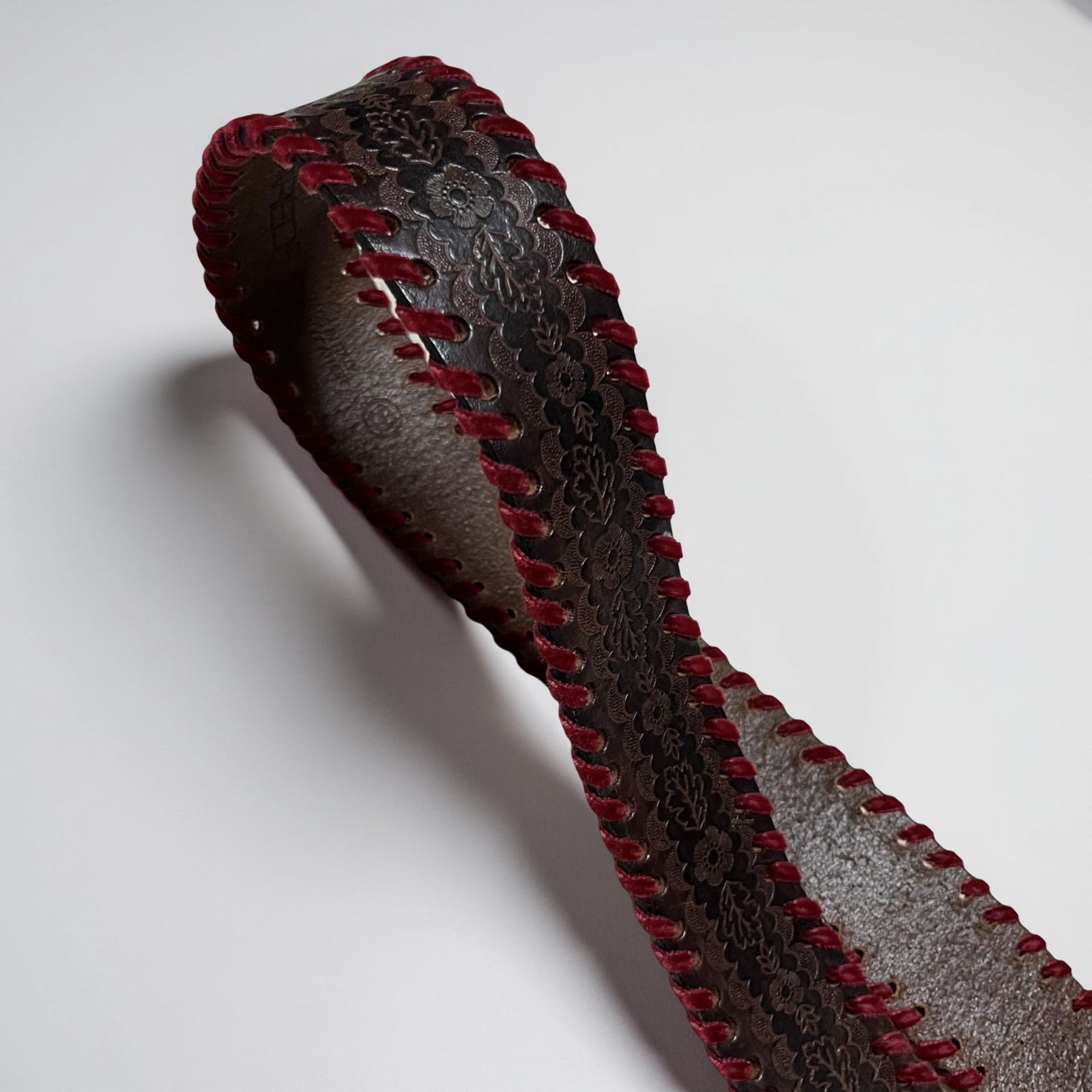 イタリア製の高級ブランド【DSQUARED2(ディースクエアード)】から、存在感あふれるプレミアムレザーベルトのご紹介です。上質なオールレザーに、美しいフラワー模様の型押しデザインが施され、職人技が光る逸品。エッジ部分には深みのあるワインレッドのベルベットコードが丁寧に編み込まれ、ラグジュアリーかつアーティスティックな印象を与えます。