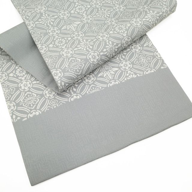 【新品】 名古屋帯 九寸 正絹 リサイクル 染め帯 手染め 型染 ライトグレー地 グレー系 七宝 松竹梅 花 極上 カジュアル 春 秋 冬 美品 仕立て上がり みやがわ sb54598