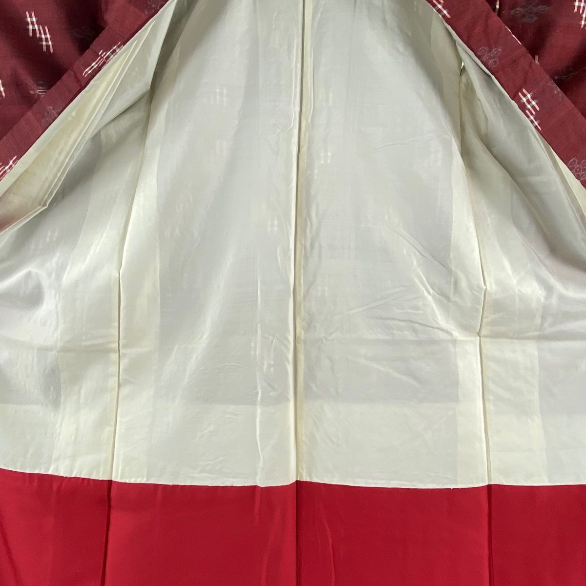 紬 身丈160cm 裄丈63cm S 袷 琉球本紬 証紙 井桁絣 幾何学 えんじ色 正絹 WWW_GLOBALQUALITYIMPORTS_COM