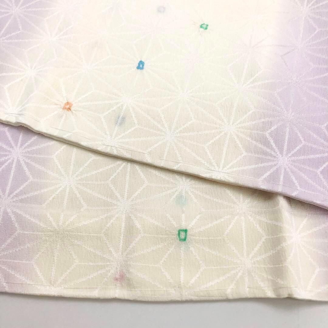乳白色の品のあるお色味に暈し、麻の葉模様に小さな絞り柄のデザインが可愛らしい素敵な柄裄のお品でございます。