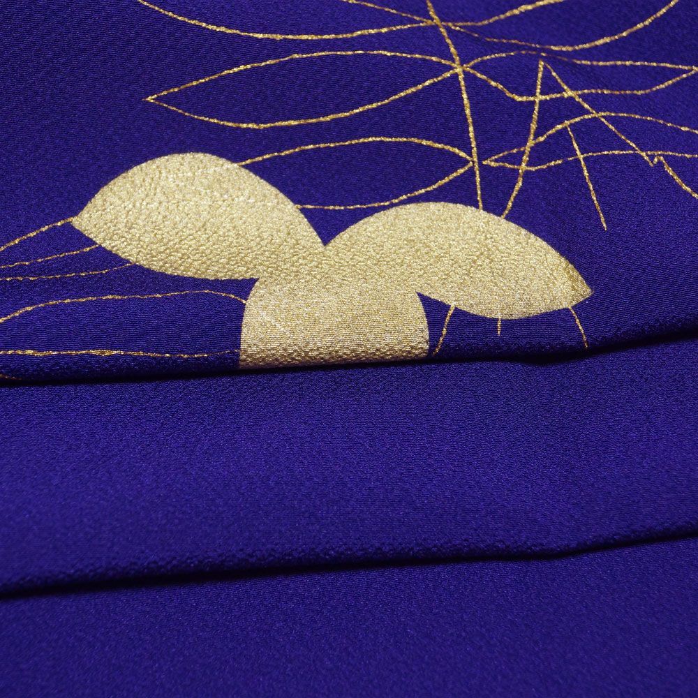 紅桔梗色系のちりめん地に本金箔の枝葉模様が施された道中着です。