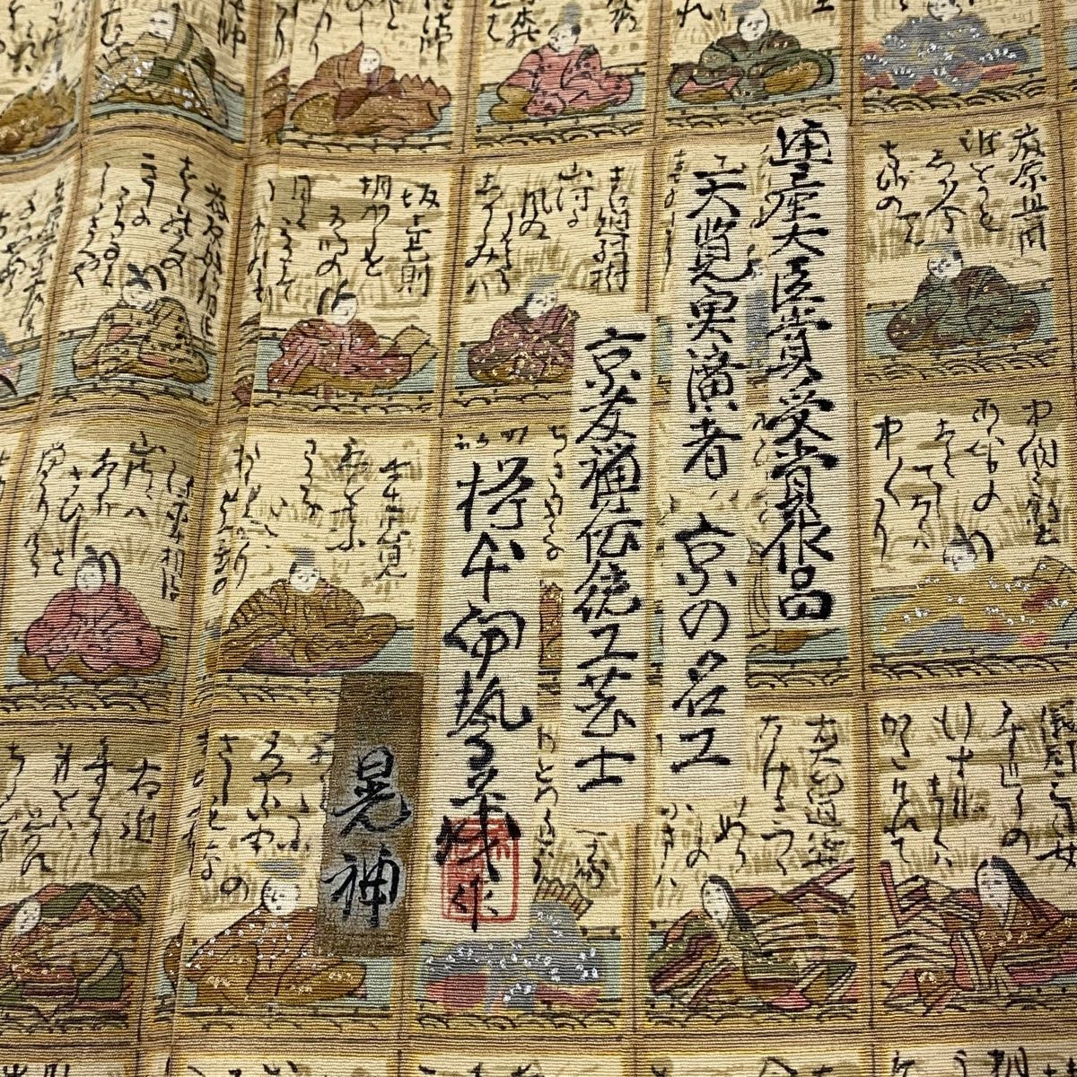 小紋 身丈156cm 裄丈64.5cm M 袷 樽本伊勢蔵 落款あり かるた 人物 金銀彩 山吹茶色 正絹の検索結果