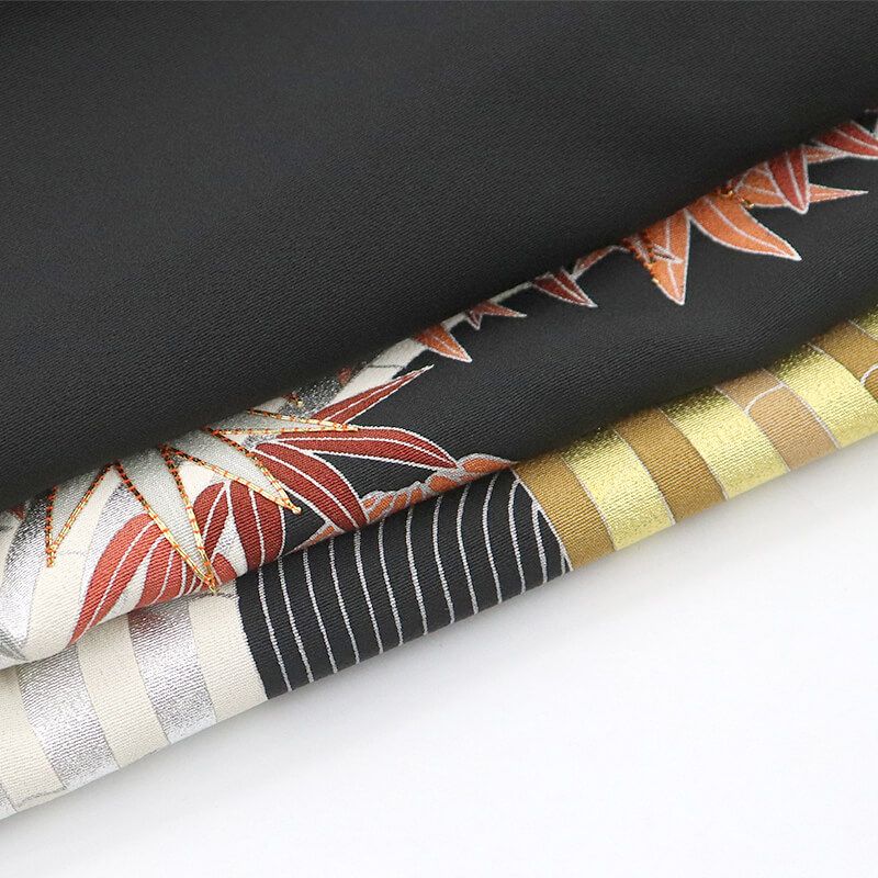 白や銀、金などを用い、竹で波文が表現されたデザイン性高めの黒留袖。