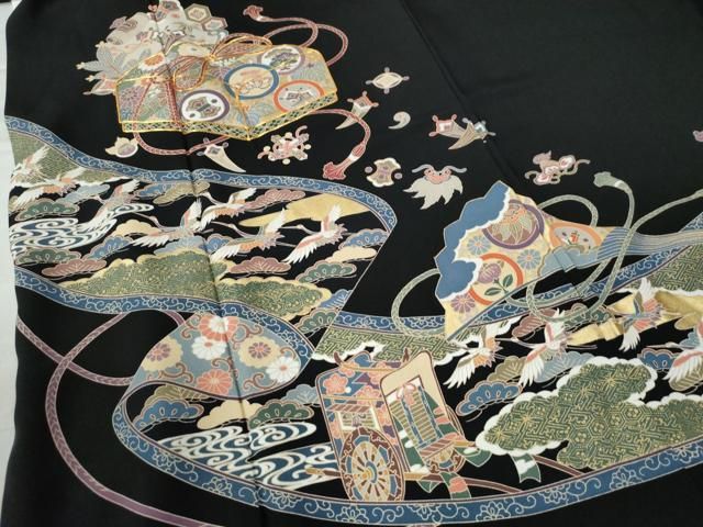 平和屋着物 豪華黒留袖 駒刺繍 文箱飛鶴扇御所車浜松花唐草文 金彩 正絹 CAAW7715yc WWW_GLOBALQUALITYIMPORTS_COM
