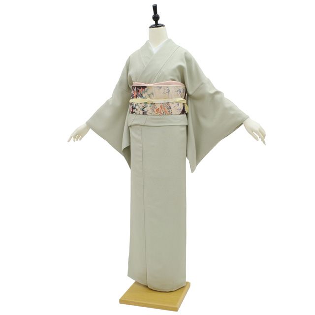 新古品 色無地 着物 正絹 寿光織 黄緑がかった ライトグレー 地紋 一つ紋 セミフォーマル 袷 春 秋 冬 仕立て上がり 身丈162 裄65 Mサイズ みやがわ sb15073の検索結果