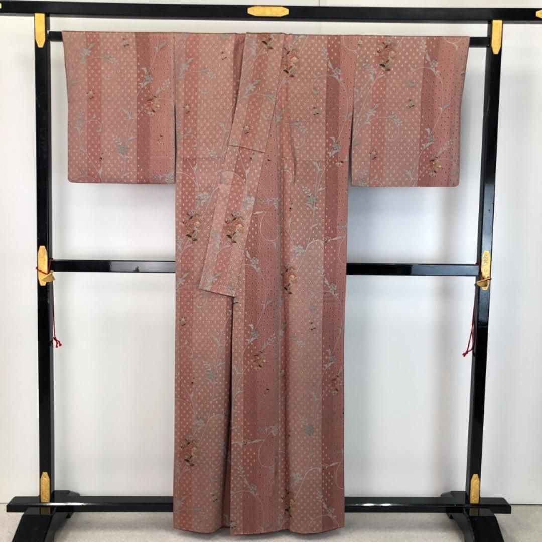 浅蘇芳色ベースのお色味に 縦縞模様、花柄などの柄行がデザインされた素敵なお品でございます。