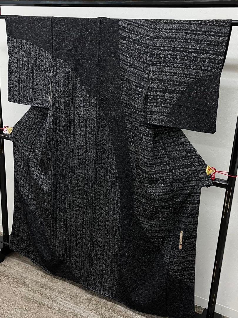 川村久太郎 落款入 絵羽小紋 総柄 個性的 紋意匠 柄八掛 正絹 黒地 WWW_GLOBALQUALITYIMPORTS_COM