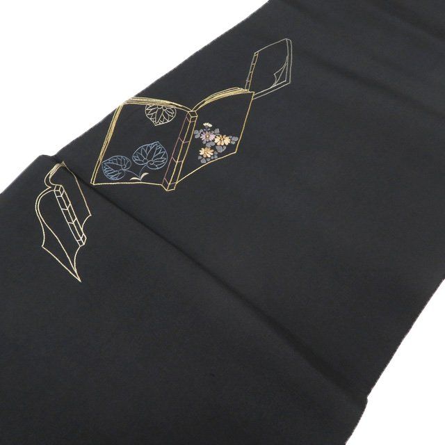 アンティーク 昼夜帯 リサイクル 正絹 お太鼓柄 刺繍 鳥と和本の図 黒色 多色 きもの北條 A1266-12 WWW_GLOBALQUALITYIMPORTS_COM