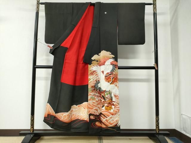 平和屋着物 アンティーク 大正ロマン 黒留袖 駒刺繍 飛鶴御所車浜松花文 金彩 正絹 CAAW7592ycの検索結果