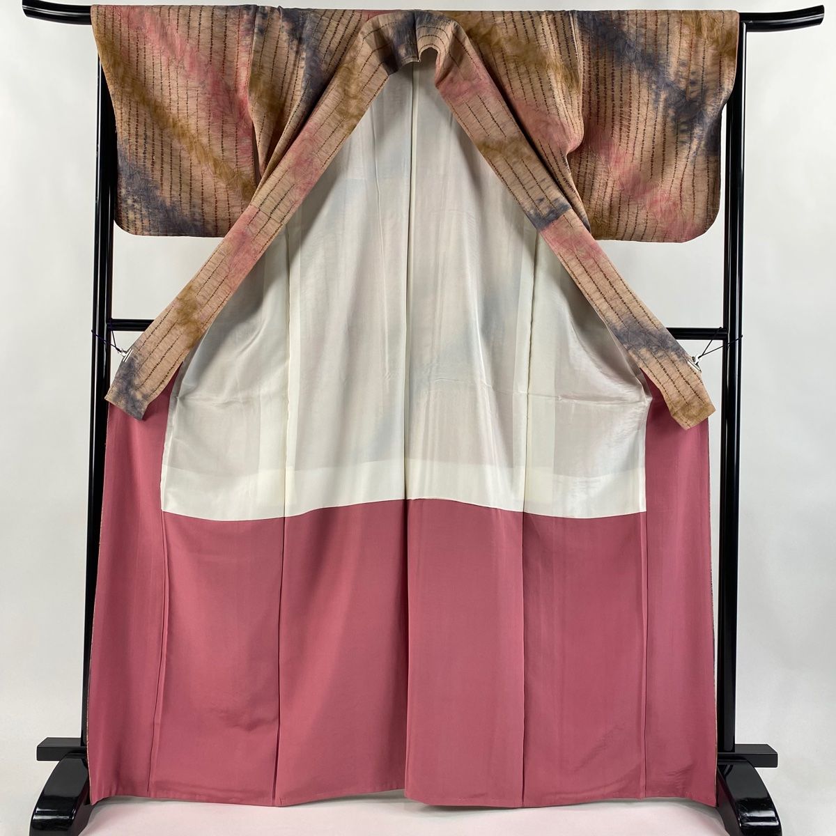 小紋 身丈167.5cm 裄丈66cm M 袷 紬地 縦縞 幾何学模様 絞り ピンクベージュ 正絹 秀品 WWW_GLOBALQUALITYIMPORTS_COM