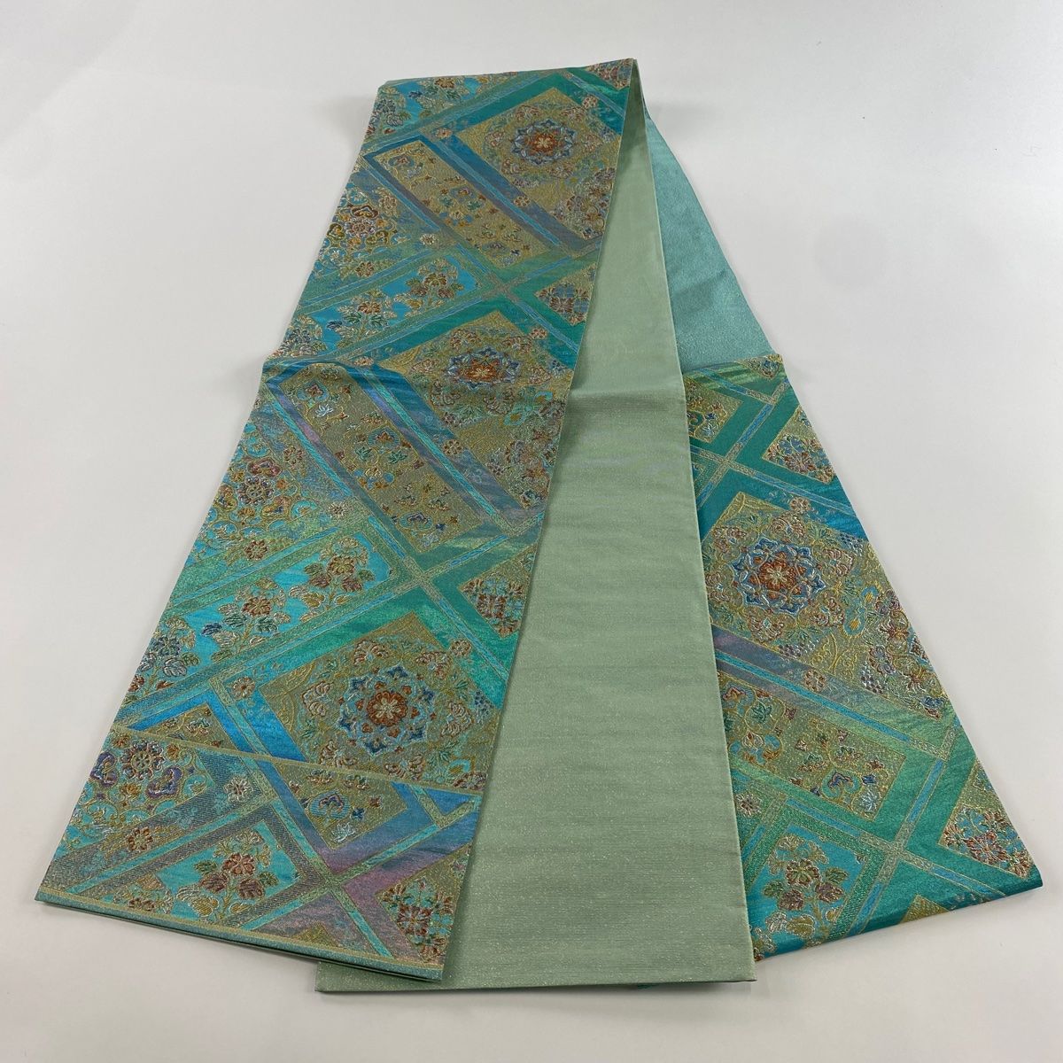 袋帯 関西仕立て 陽文綴 華文 花唐草 金糸 箔 青緑 六通 正絹の検索結果