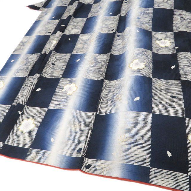 小紋 着物 正絹 袷 カジュアル 長格子模様 桜模様 濃紺色 多色 金 身丈159.5cm 裄70cm M きもの北條 A1282-14 WWW_GLOBALQUALITYIMPORTS_COM