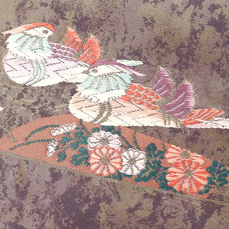 名古屋帯 正絹 九寸帯 六通柄 灰紫 箔地 鴛鴦 扇文 長さ353cm 幅30.5cm リサイクル 和装セミフォーマル 着物 仕立て上がり WWW_GLOBALQUALITYIMPORTS_COM