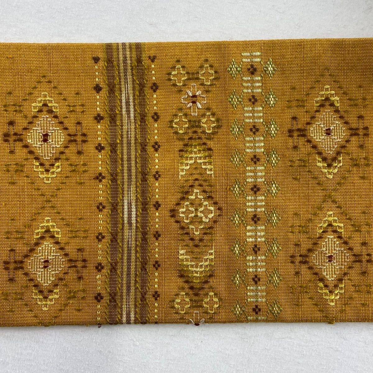 名古屋帯 証紙 読谷山花織 草木染 菱 幾何学模様 山吹色 正絹 WWW_GLOBALQUALITYIMPORTS_COM