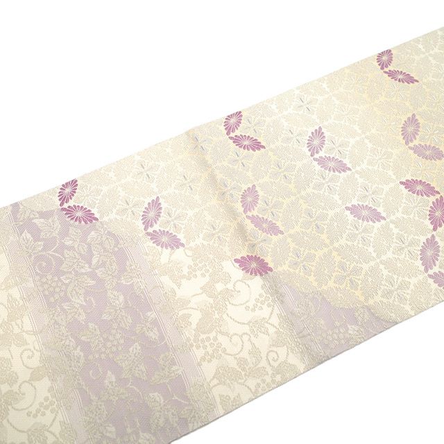 新古品 袋帯 フォーマル 二方向 二種のお太鼓柄 正絹 金華山織 銀糸 オフホワイト 薄紫 花七宝 葡萄唐草 春 秋 冬 双図 上 袋帯 2種類のお太鼓 仕立て上がり みやがわ sb54676 WWW_GLOBALQUALITYIMPORTS_COM