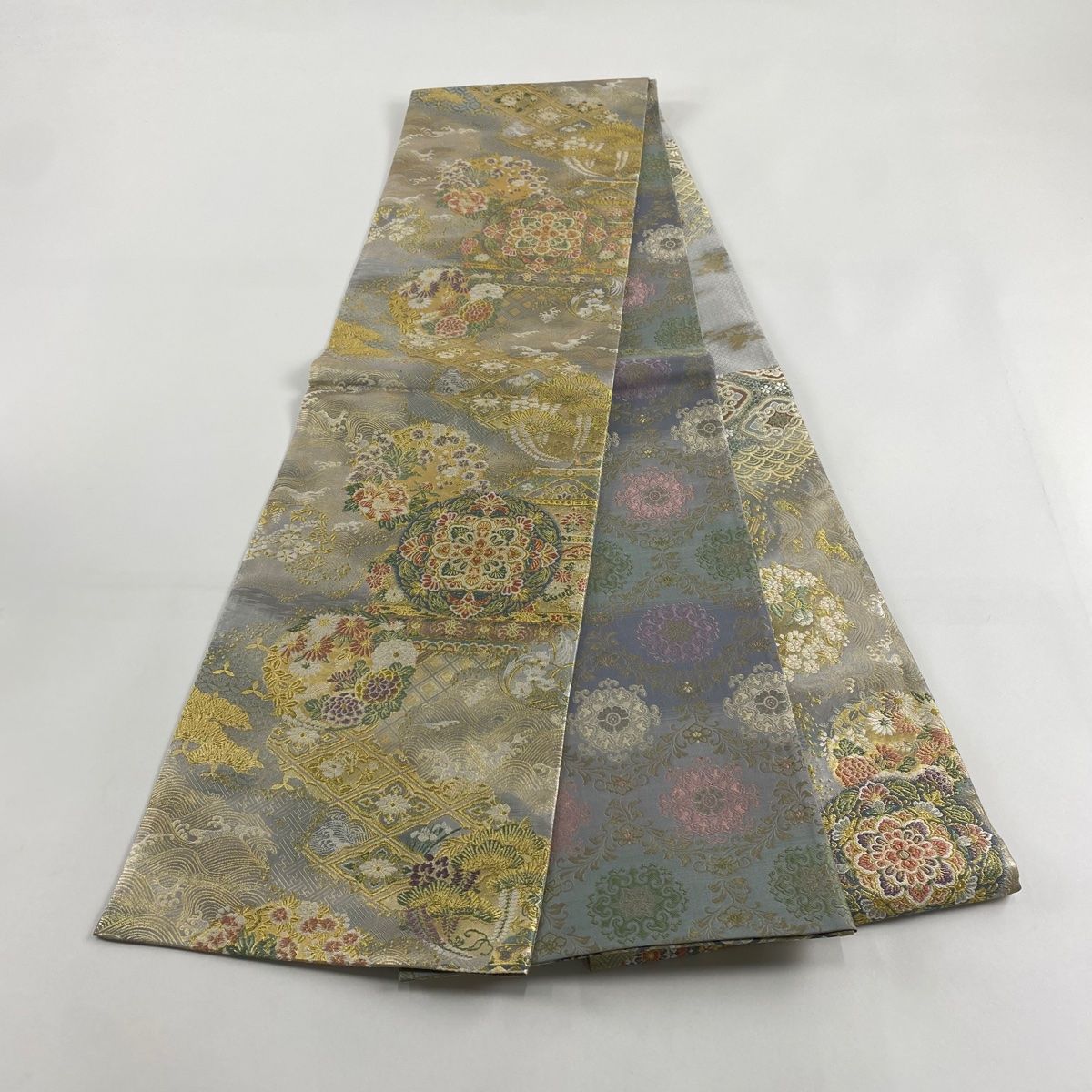 袋帯 秀品 華文 花丸文 金糸 箔 灰色 全通 正絹 WWW_GLOBALQUALITYIMPORTS_COM
