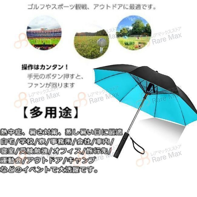 【扇風機機能】傘に搭載された専用の扇風機から吹き降りてくる風が首や頭などに当たり涼しくて快適です。傘にこもった空気を扇風機で追い出し、まるで木陰にいる涼しさに感じられます。
