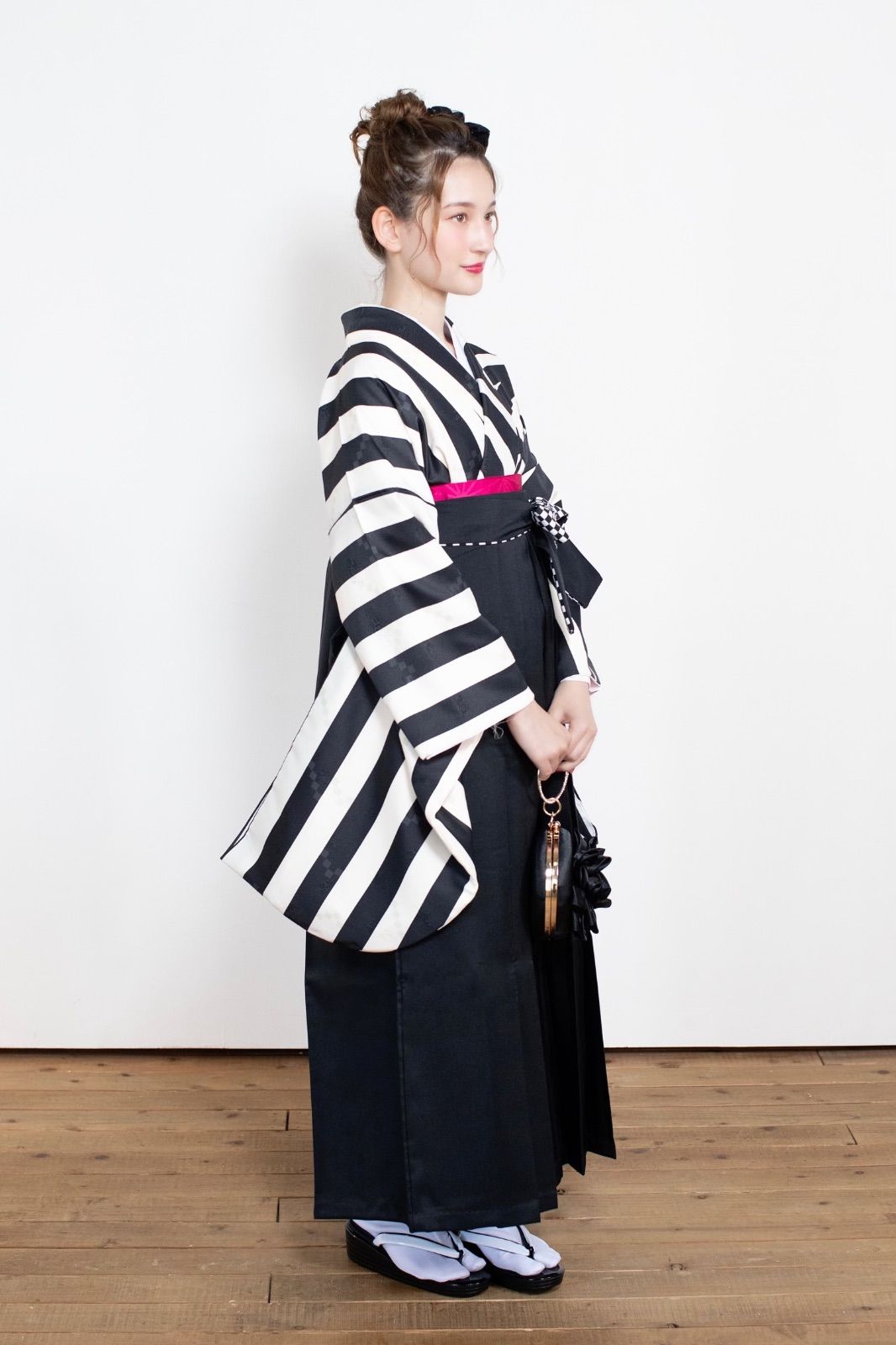 着物ジェンヌ 卒業式袴3点セット 幾何学模様とストライプ 二尺袖 袴 白黒×黒 WWW_GLOBALQUALITYIMPORTS_COM