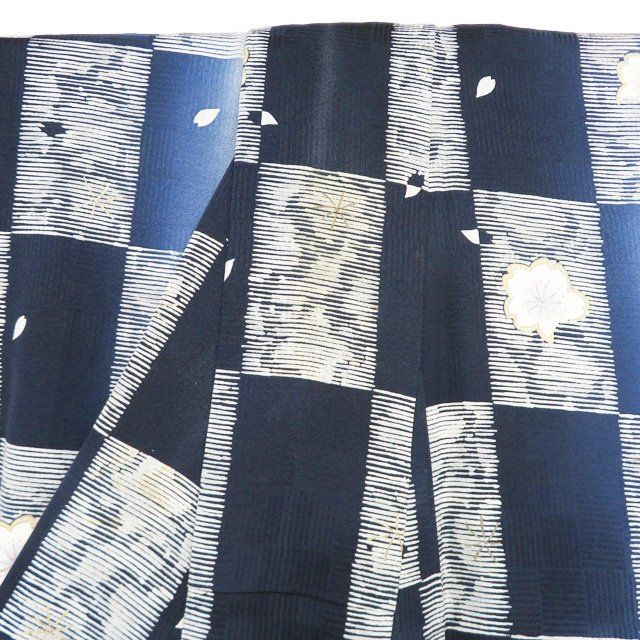 小紋 着物 正絹 袷 カジュアル 長格子模様 桜模様 濃紺色 多色 金 身丈159.5cm 裄70cm M きもの北條 A1282-14 WWW_GLOBALQUALITYIMPORTS_COM