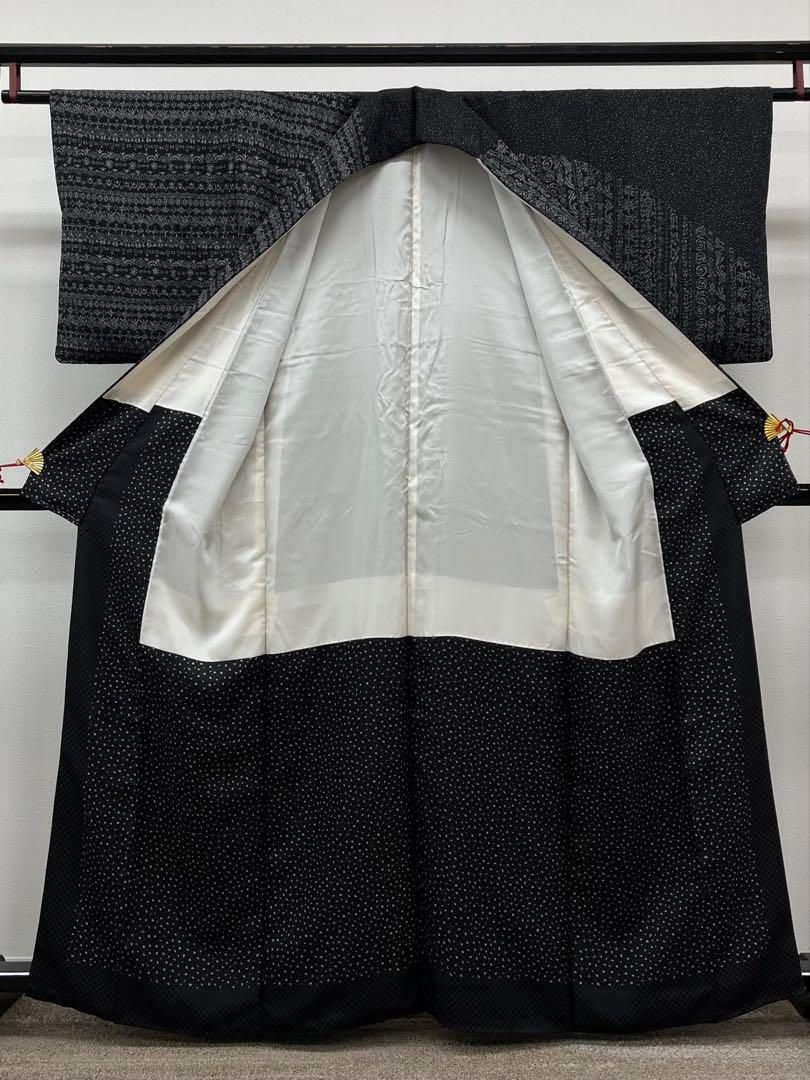 川村久太郎 落款入 絵羽小紋 総柄 個性的 紋意匠 柄八掛 正絹 黒地 WWW_GLOBALQUALITYIMPORTS_COM